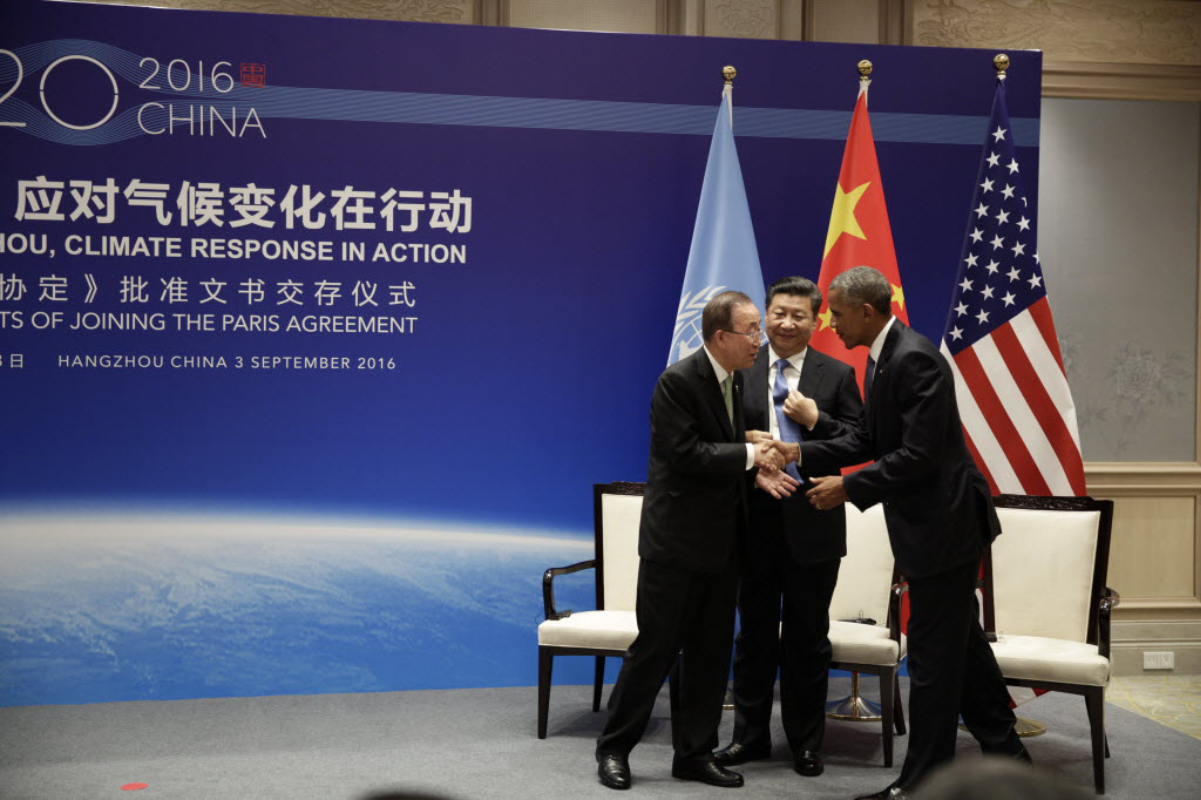 President Barack Obama hands the Paris Agreement documents to United Nations Secretary-General Ban Ki-moon during a climate event in China on September 3, 2016 (Source: National Archives)