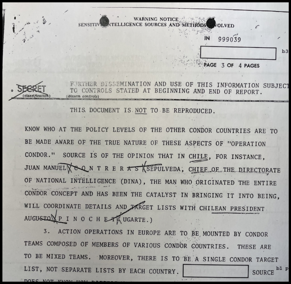 - A CIA report on how the Teseo unit will select targets “to liquidate” in Europe and who will know about these missions. The source of the CIA intelligence suggests that “in Chile, for instance, Juan Manuel Contreras Sepulveda, chief of the Directorate of National Intelligence (DINA) the man who originated the entire Condor concept and has been the catalyst in bringing it into being, will coordinate details and target lists with Chilean President Augusto Pinochet Ugarte.”