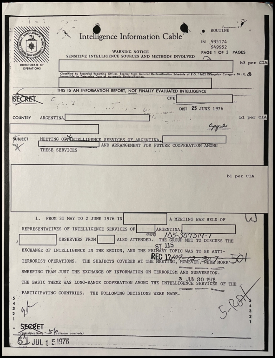 This CIA report summarizing the second meeting of Southern Cone intelligence services in Santiago, Chile, from May 31 to June 2, 1976, is the first known declassified document to reference “Condor.” The report states that “Condor, the name given to this cooperative arrangement, will establish a basic computerized data bank” to centralize intelligence registries on operations against leftist enemies. The CIA also reports that, besides intelligence sharing, Chile “agreed to operate covertly” with the Argentines and Uruguayans to conduct operations “against the Revolutionary Coordinating Junta (JCR) and other terrorists.” Those operations to assassinate targets abroad would expand Condor’s reach outside of the Southern Cone to Europe and elsewhere.